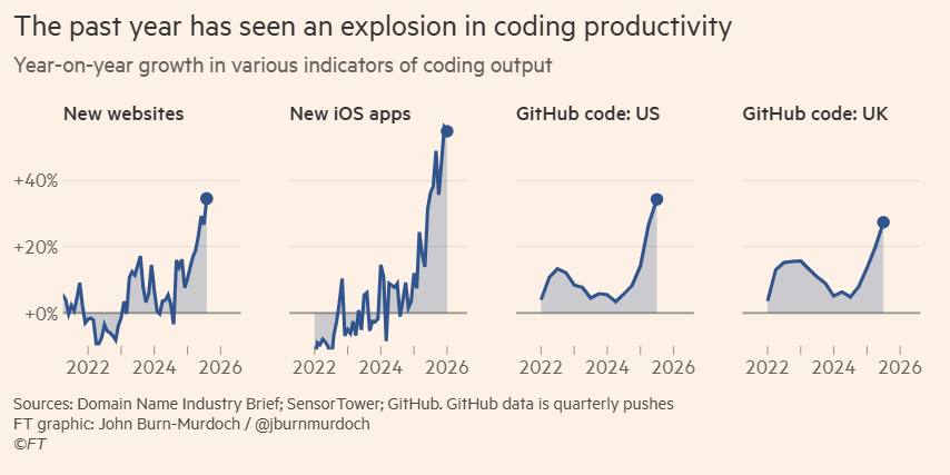 根据金融时报(Financial Times, FT)在2026年2月发布的分析报道(多位消息源指出可能出自首席数据记者 John Burn-Murdoch 之手或其制作的图表),文章的核心内容是关于AI技术如何推动编程和软件开发生产力的爆发性增长。